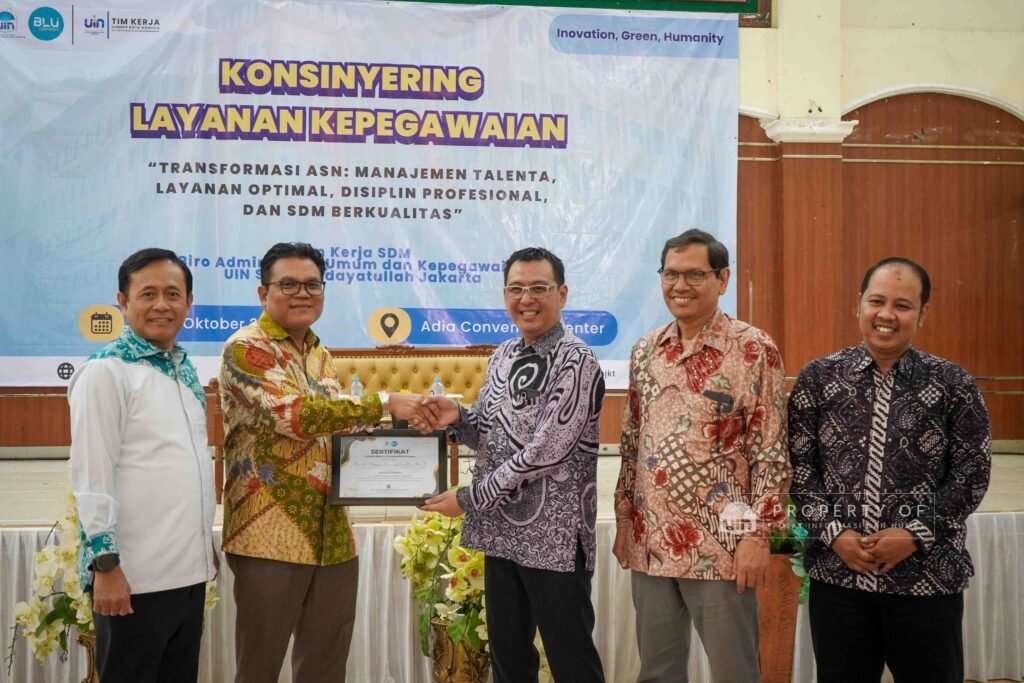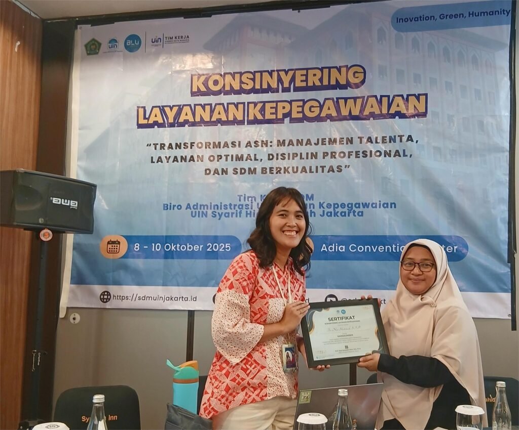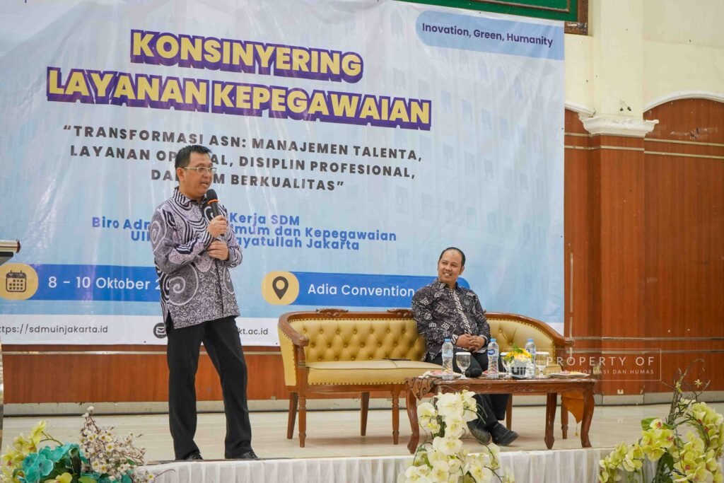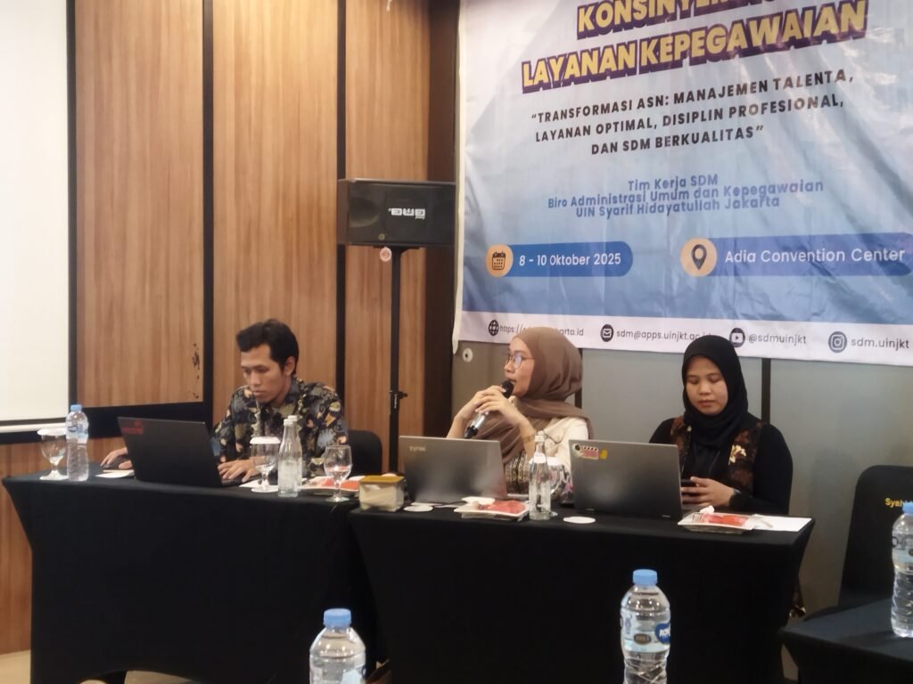 Adia Convention Center – Tim Kerja SDM Biro AUK UIN Jakarta menggelar Konsinyering Layanan Kepegawaian dengan tema “Transformasi ASN: Manajemen Talenta, Layanan Optimal, Disiplin Profesional, dan SDM Berkualitas. Kegiatan ini berlangsung pada 8 s.d 10 Oktober di Adia Convention Center yang beralamat di Jalan Kertamukti Nomor 5, Cirendeu, Kecamatan Ciputat Timur, Tangerang Selatan.
